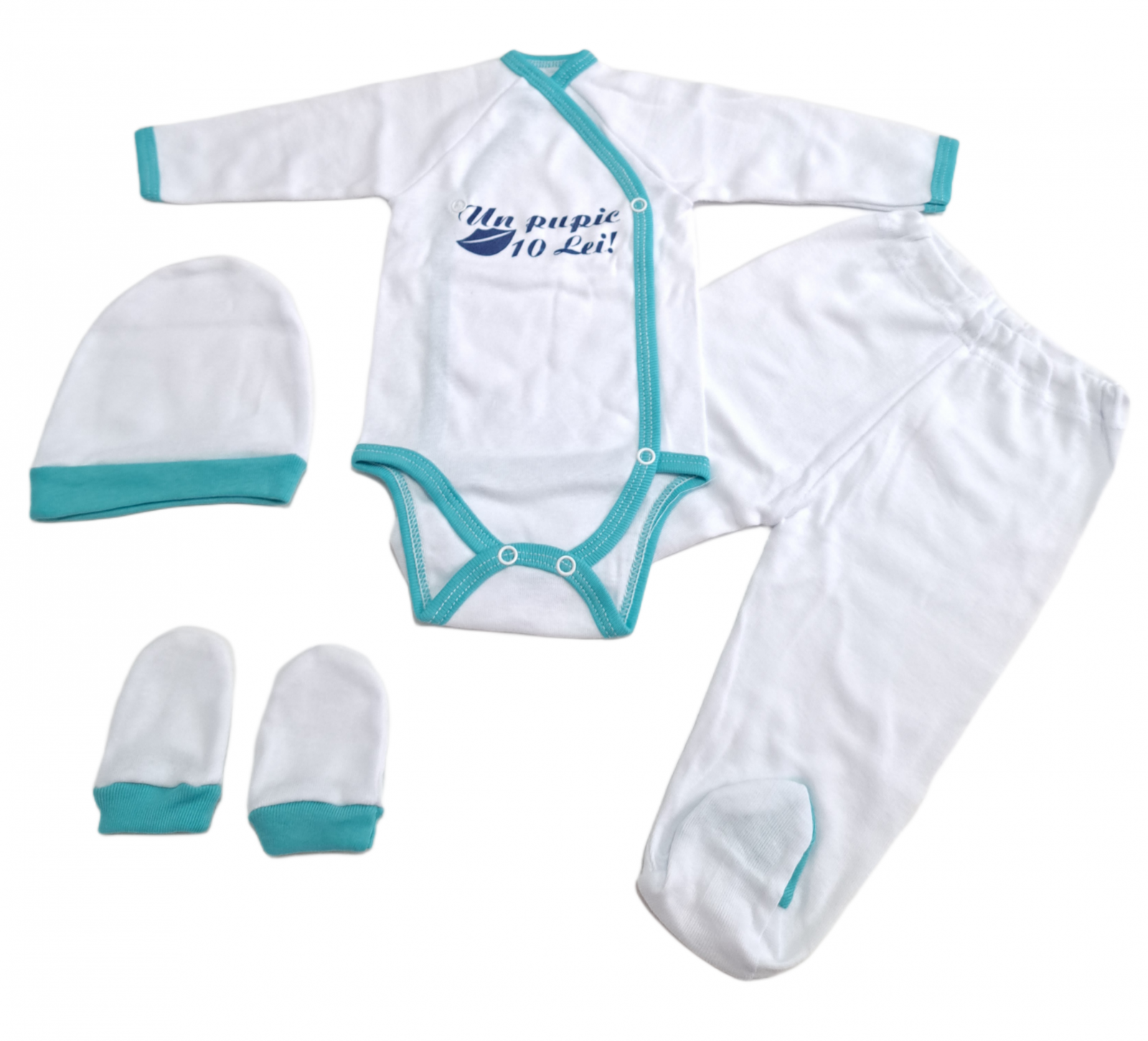 Costumaș 4 piese pentru bebeluși , realizat din bumbac 100% moale și delicat, ideal pentru pielea sensibilă.