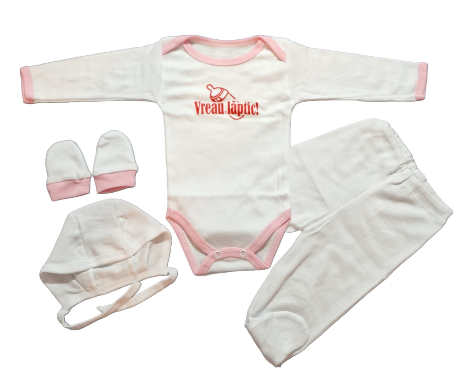 Costumaș 4 piese pentru bebeluși , realizat din bumbac 100% moale și delicat, ideal pentru pielea sensibilă.
