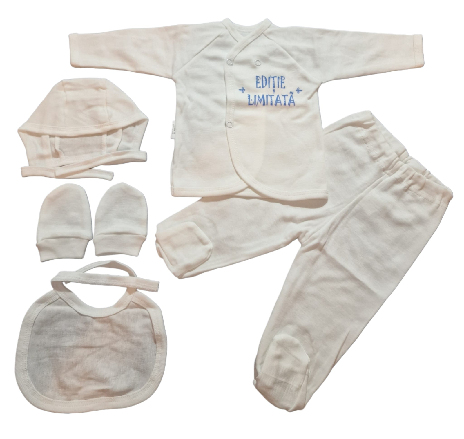 Costumaș 5 piese nou-născut crem din bumbac 100% – Fabricat în România