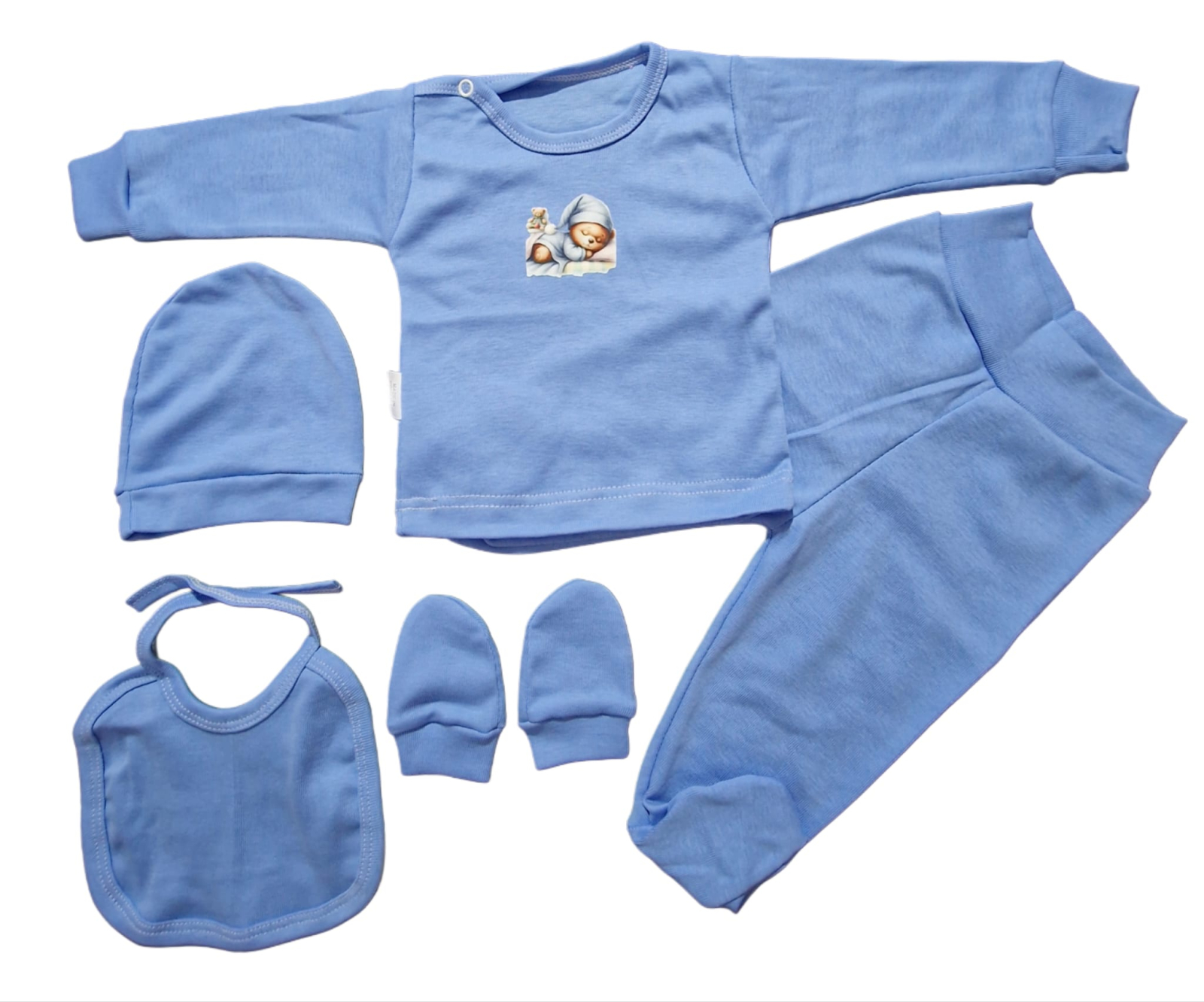 Setul include: bluziță tcu capse la gat, pantalonași cu botoșei, căciuliță, mănuși și bavețică asortată.