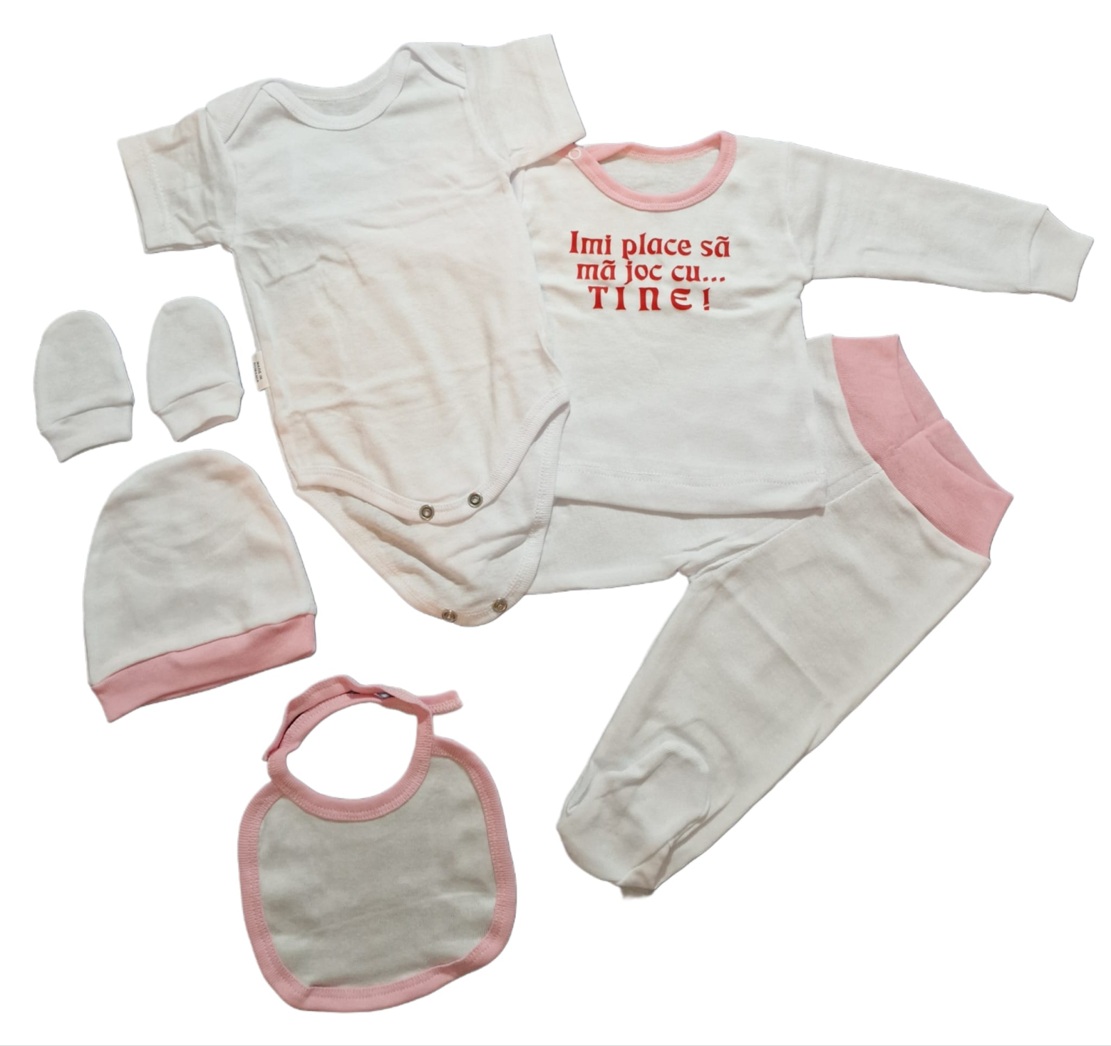 Setul include: Bluza cu mesaj pe piept, body maneca scurta cu capse intre picioare, pantalonași cu botoșei, căciuliță, mănuși și bavețică asortată.