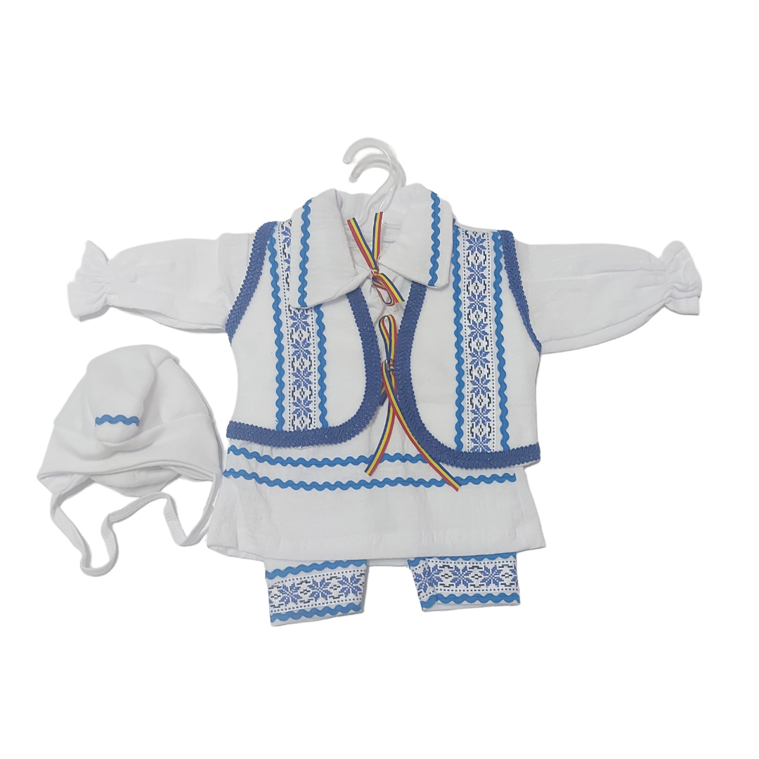 Îmbracă-ți micuțul în straie de sărbătoare cu un costumaș tradițional românesc, realizat cu grijă în România. Din bumbac moale și materiale confortabile, aceste costumașe sunt perfecte pentru botez, ședințe foto, serbări sau zile speciale.