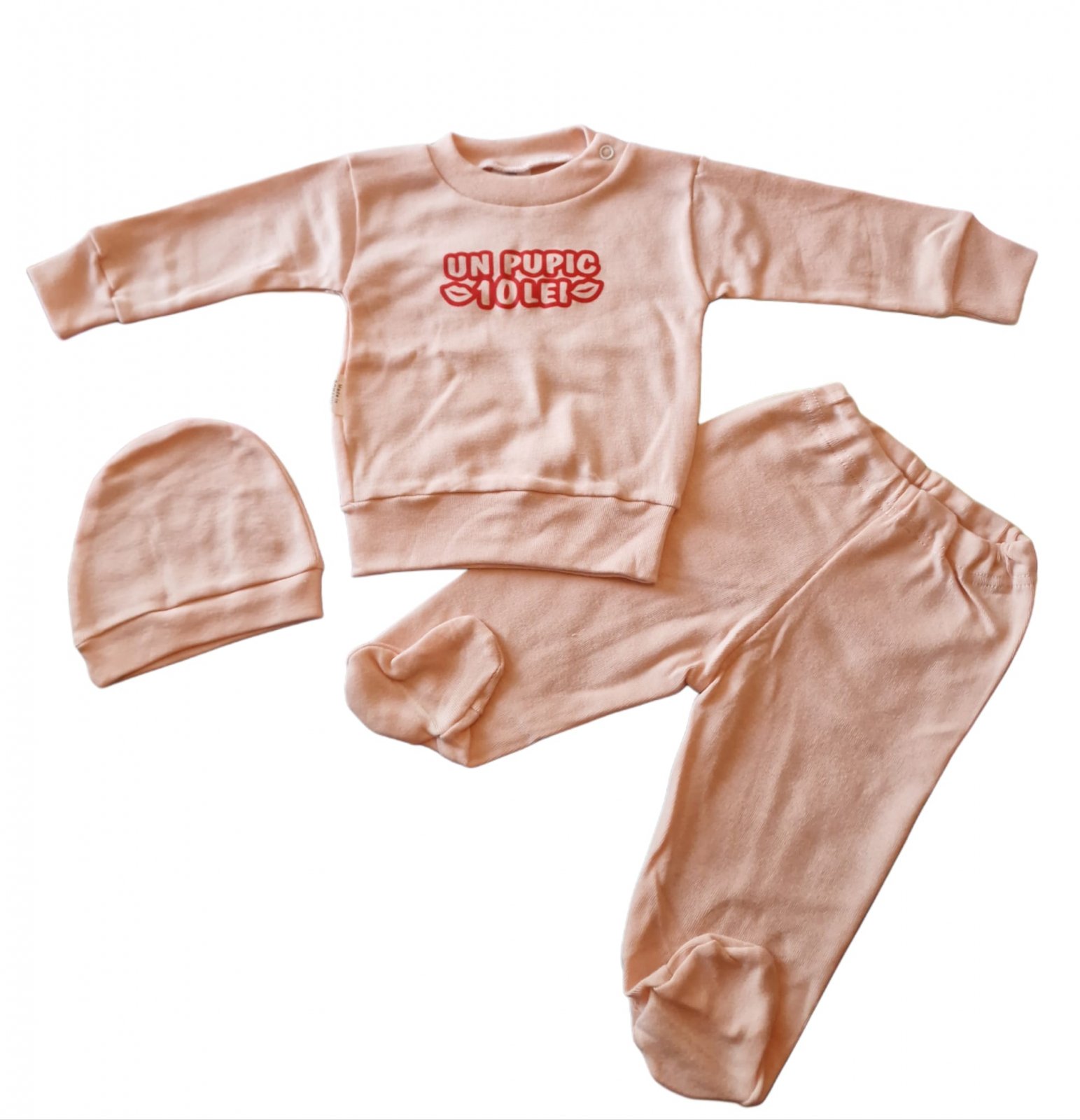 Costumaș 3 piese bebeluși – bluză, pantaloni și căciuliță din bumbac moale
