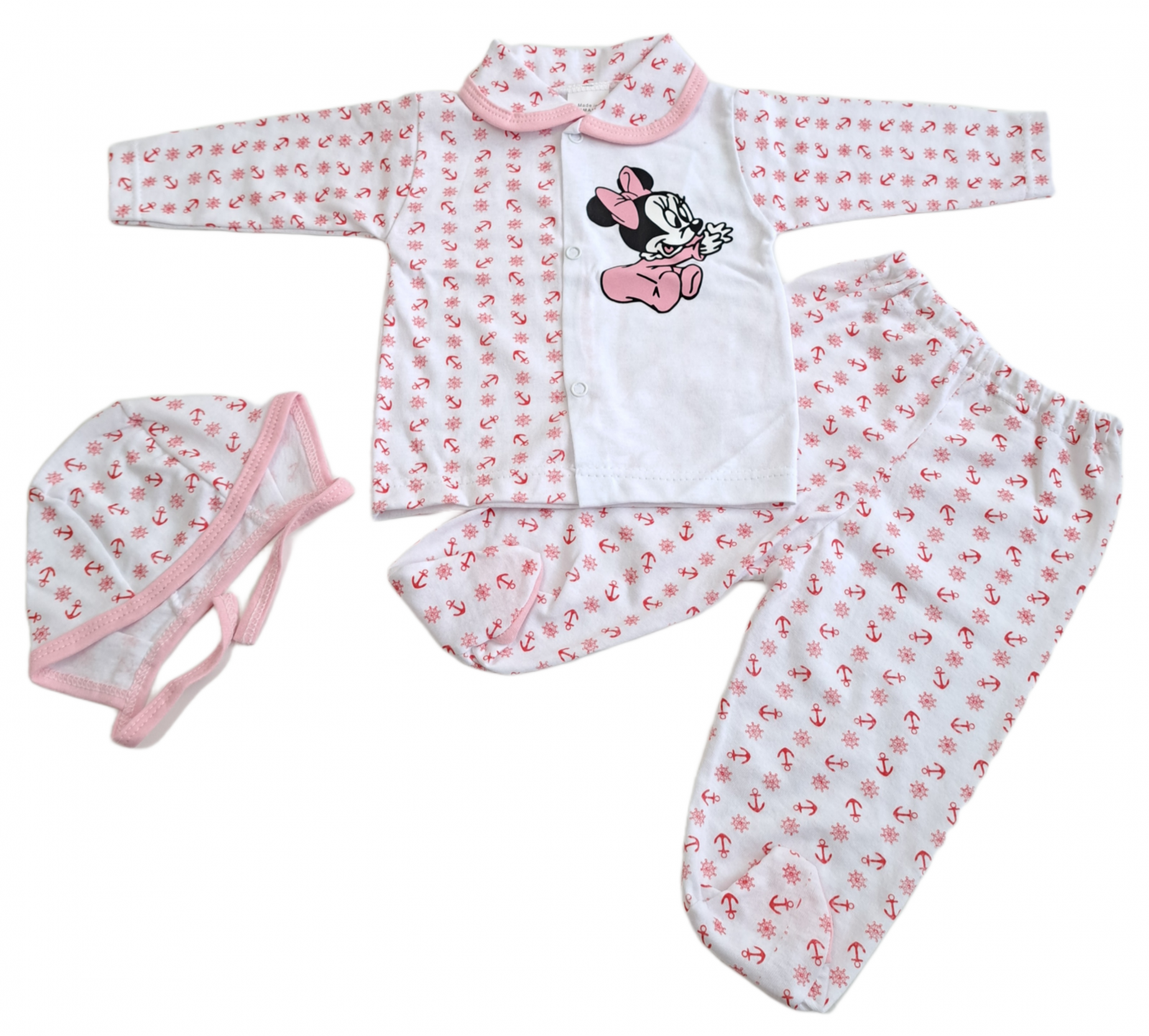 • Bluziță cu mânecă lungă și imprimeu simpatic cu deschidere capse in fata, pantaloni cu botoșei integrați si căciuliță asortată