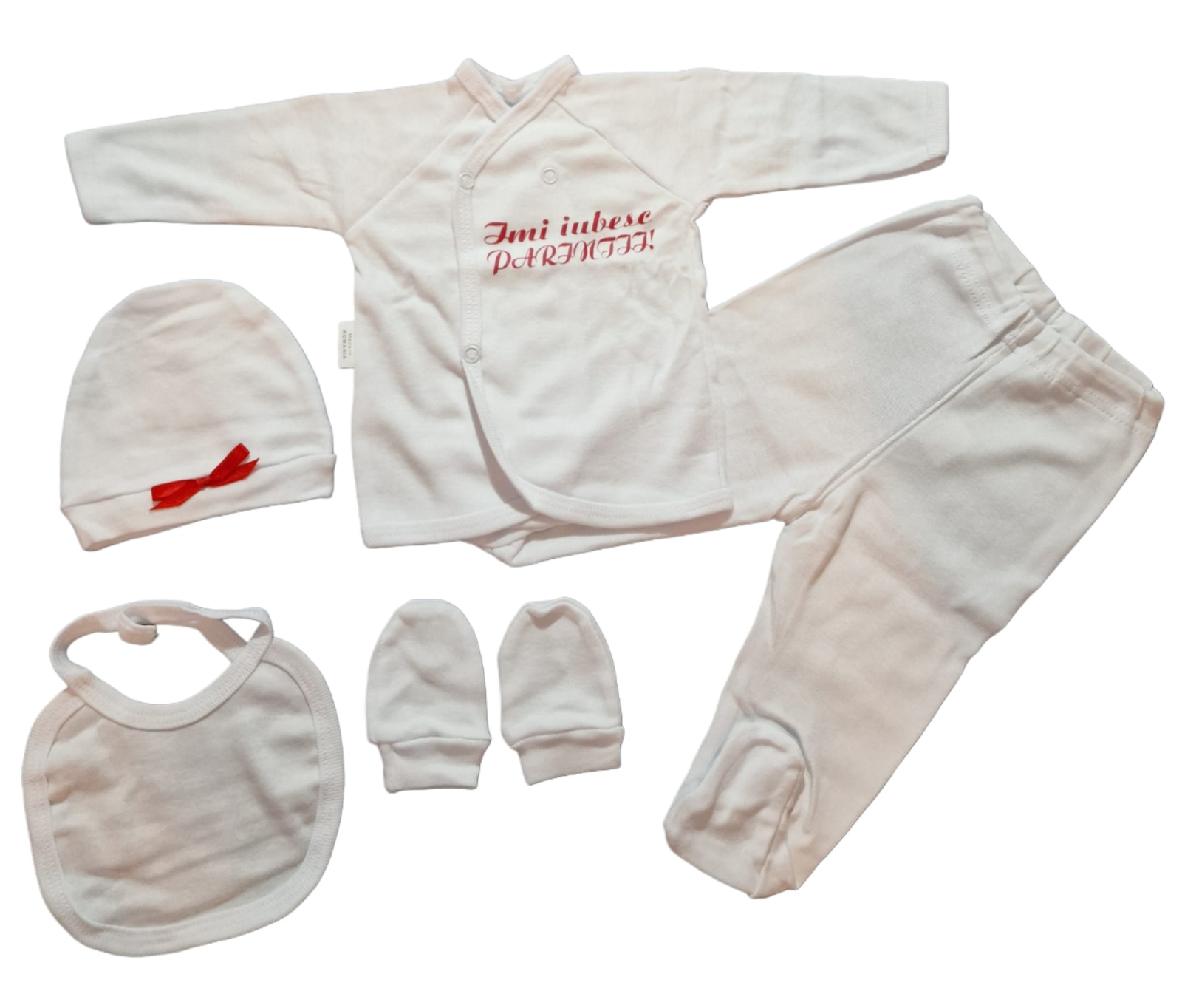 Setul include: bluziță tip kimono cu capse frontale, pantalonași cu botoșei, căciuliță, mănuși și bavețică asortată.