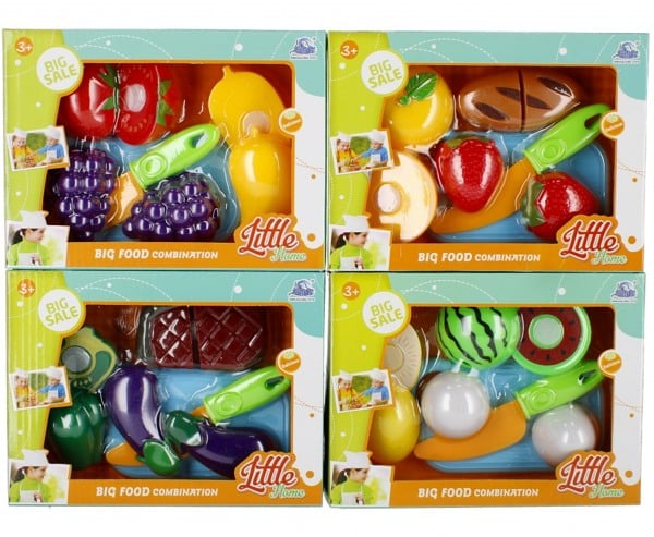 Setul include: fructe și legume - imitație de produse reale, în plus, fructele și legumele sunt prezente și variază în funcție de set, toate fructele și legumele sunt împărțite în două părți, conectate împreună cu Velcro, care imită procesul de tăiere a acestora.