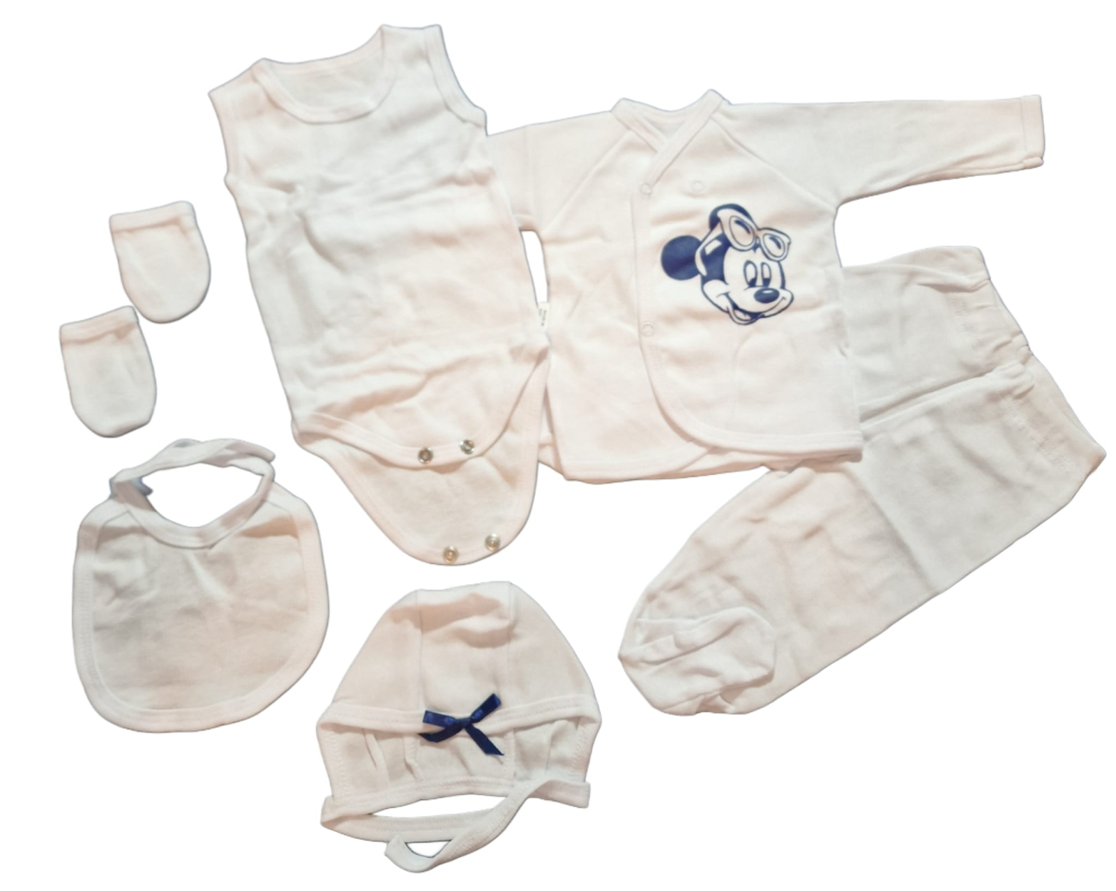 Setul include: bluziță tip kimono cu capse frontale, body, pantalonași cu botoșei, căciuliță, mănuși și bavețică asortată.