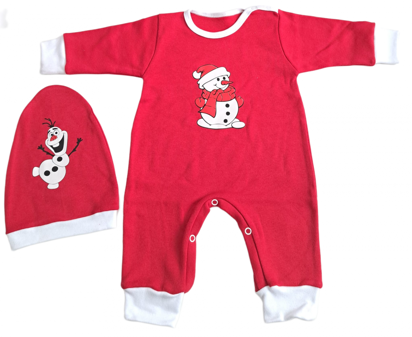 O ținută adorabilă pentru micuțul tău în spiritul sărbătorilor! Salopeta roșie cu imprimeu simpatic  și căciuliță asortată aduce bucurie și confort în fiecare clipă. Realizată din bumbac moale și plăcut la atingere, este perfectă pentru joacă, somn sau fotografii de Crăciun.