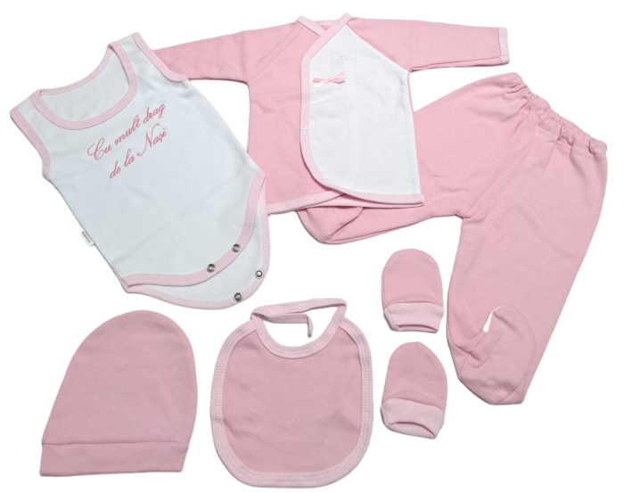 Set complet de 6 piese din bumbac 100%, Fabricat în România. Include: body, bluziță, pantaloni, căciulă, bavețică și mănuși. Ideal pentru trusou sau purtare zilnica