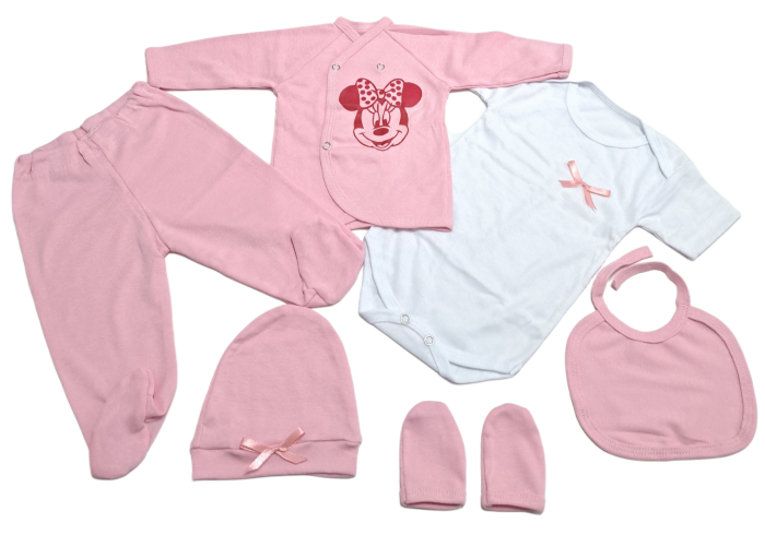 Set complet de 6 piese pentru nou-născuți, realizat din bumbac 100% de înaltă calitate, fabricat cu drag în România. Setul include tot necesarul pentru primele zile: body, bluziță, pantaloni, căciuliță, bavețică și mănuși. Material delicat, ideal pentru pielea sensibilă a bebelușilor.