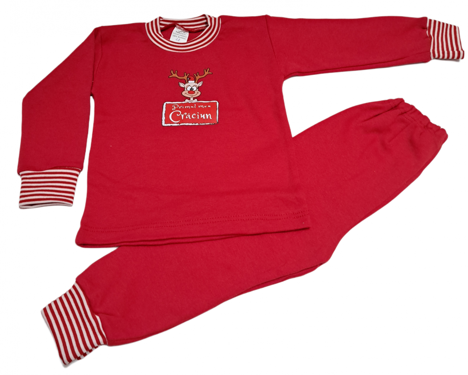 Un set adorabil pentru primele sărbători ale micuțului tău! Costumașul include Bluza cu imprimeu si pantalonași roșii.