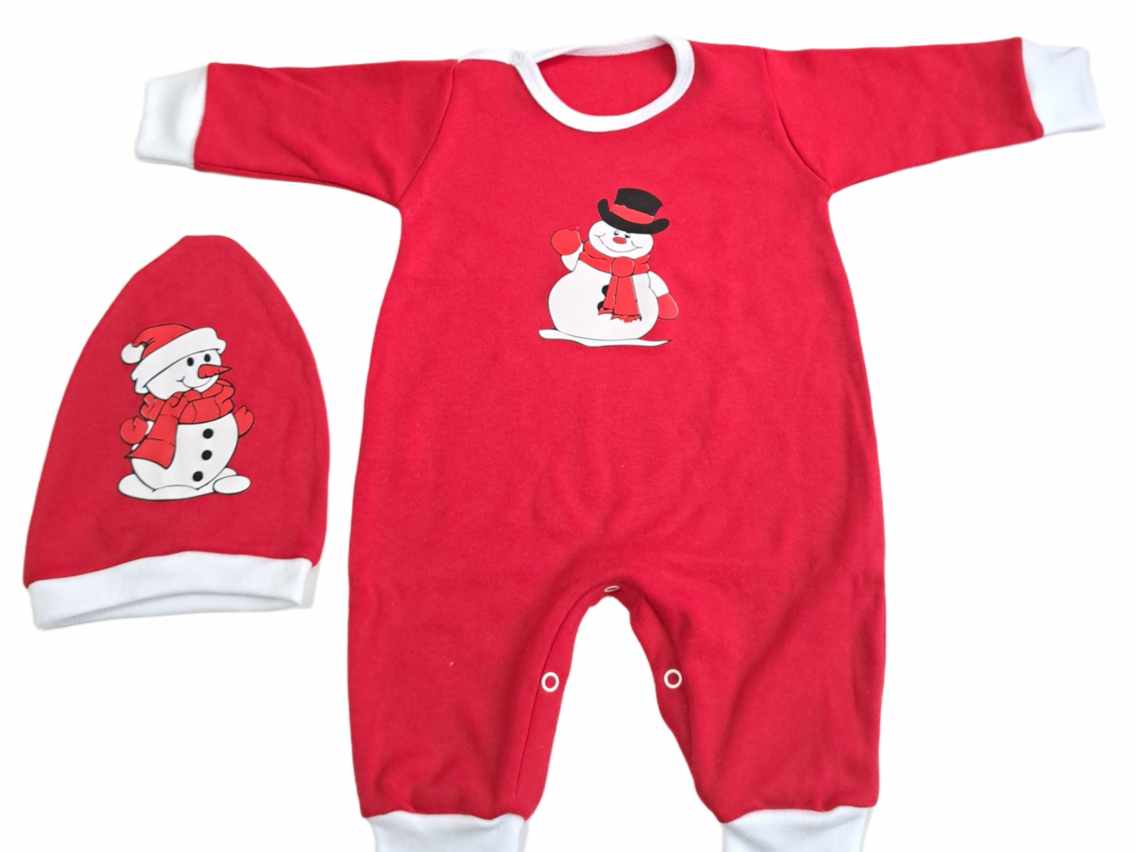 O ținută adorabilă pentru micuțul tău în spiritul sărbătorilor! Salopeta roșie cu imprimeu simpatic  și căciuliță asortată aduce bucurie și confort în fiecare clipă. Realizată din bumbac moale și plăcut la atingere, este perfectă pentru joacă, somn sau fotografii de Crăciun.