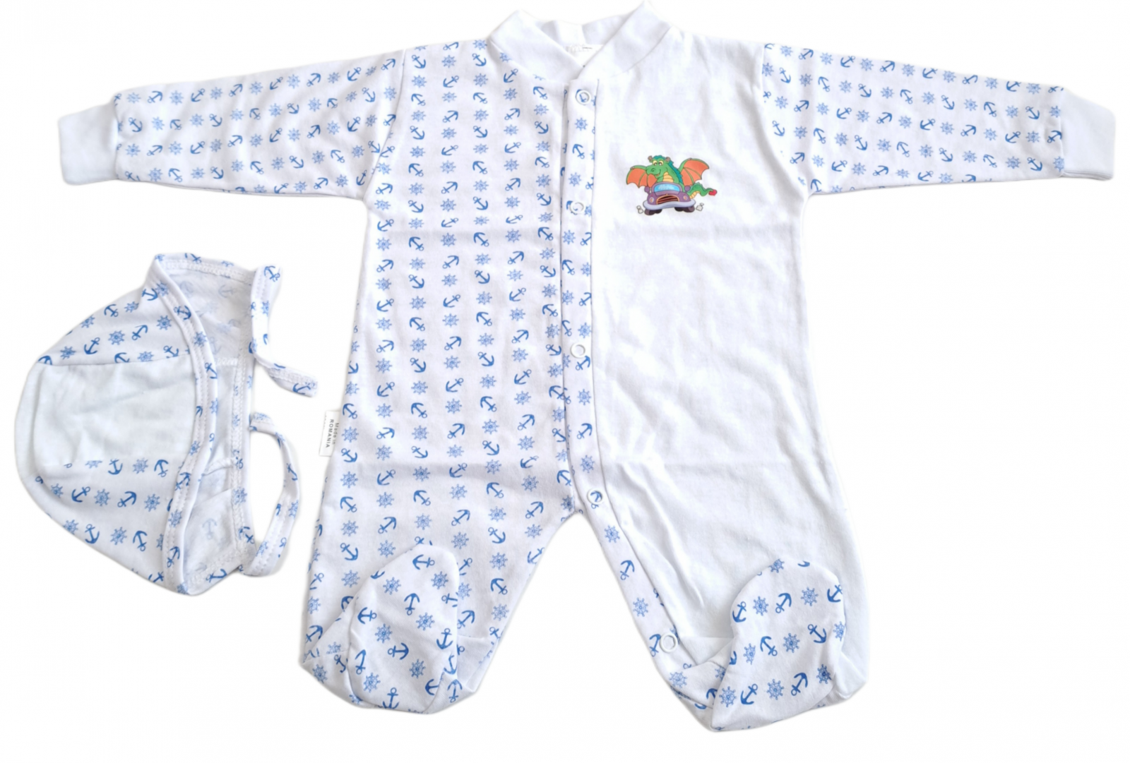 Salopetă cu căciuliță BubuKids – Alb cu Imprimeu Bleu ❤️👶